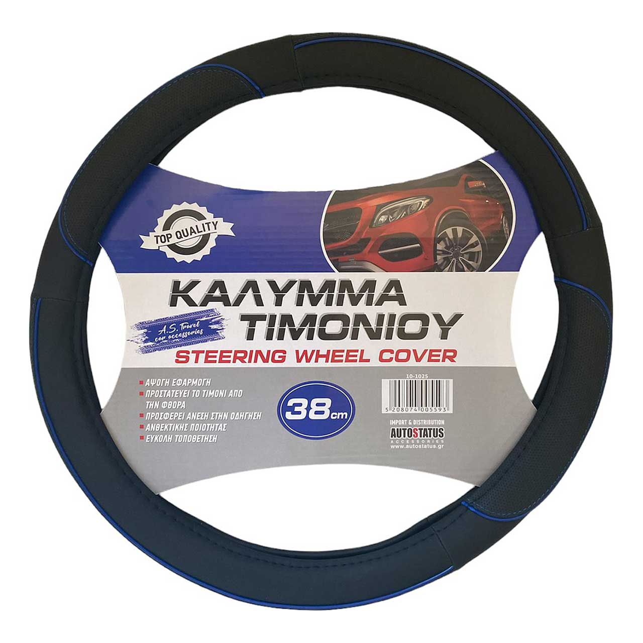 Κάλυμμα τιμονιού εξαιρετικής ποιότητας και εφαρμογής με μπλε γραμμές.