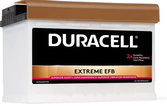 Η Duracell Extreme σχεδιάστηκε για τη χρήση σε οικολογικά οχήματα με λειτουργία Start/Stop.Η τεχνολογία EFB (Enhanced Flooded Battery) χρησιμοποιείται κυρίως στα οχήματα ΙΧ μεσαίας κατηγορίας, στα μικρά οχήματα και στα απλά συστήματα Start/Stop.Τα premium προϊόντα Duracell Extreme πληρούν τις προδιαγραφές των κορυφαίων κατασκευαστών αυτοκινήτων και με αποτελούν την πρώτη επιλογή για επιβατικά αυτοκίνητα χαμηλής κατανάλωσης καυσίμου με σύστημα Start/Stop.